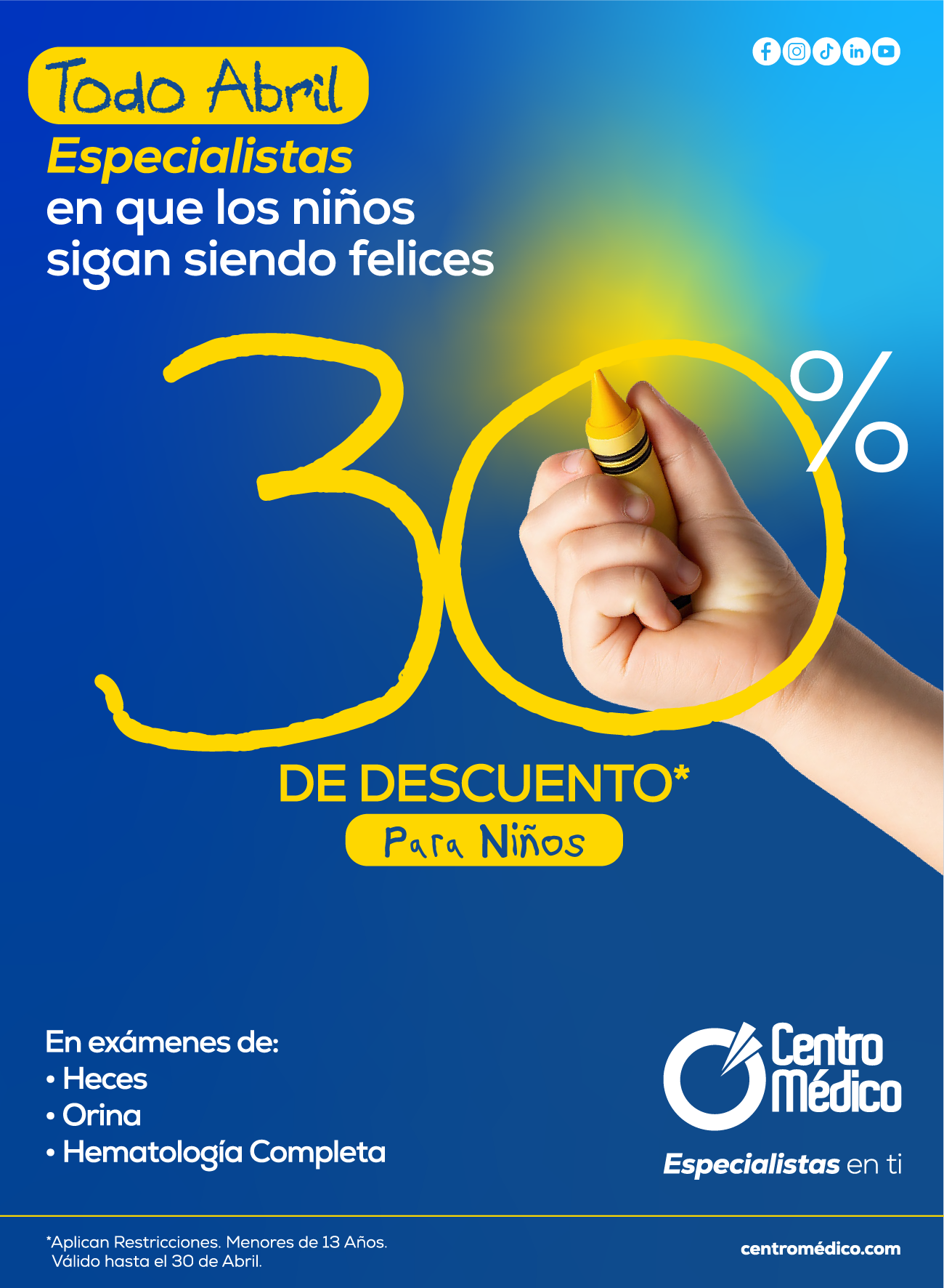 En Centro Médico, sabemos que el bienestar de tus pequeños es tu prioridad. Por eso, durante todo el mes de abril, te traemos un 30% de descuento en exámenes de laboratorio para niños.