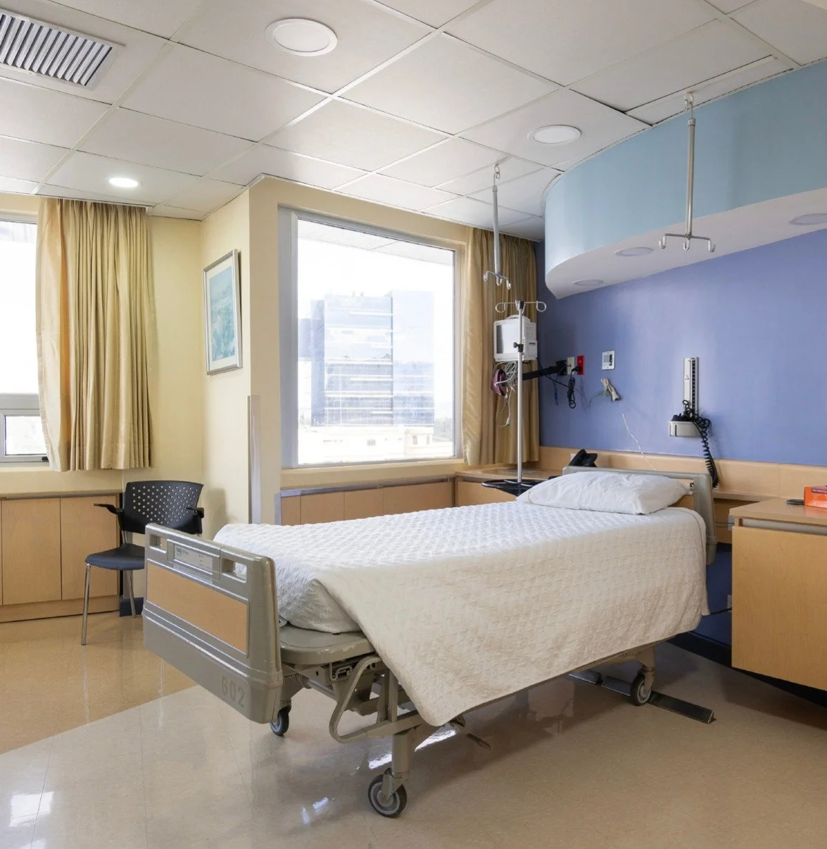 Amplia habitación con baño privado, asientos para acompañantes, instalaciones de equipo especializado, control de temperatura y ventilación, amplia iluminación y estrictos protocolos de higiene y atención a pacientes.